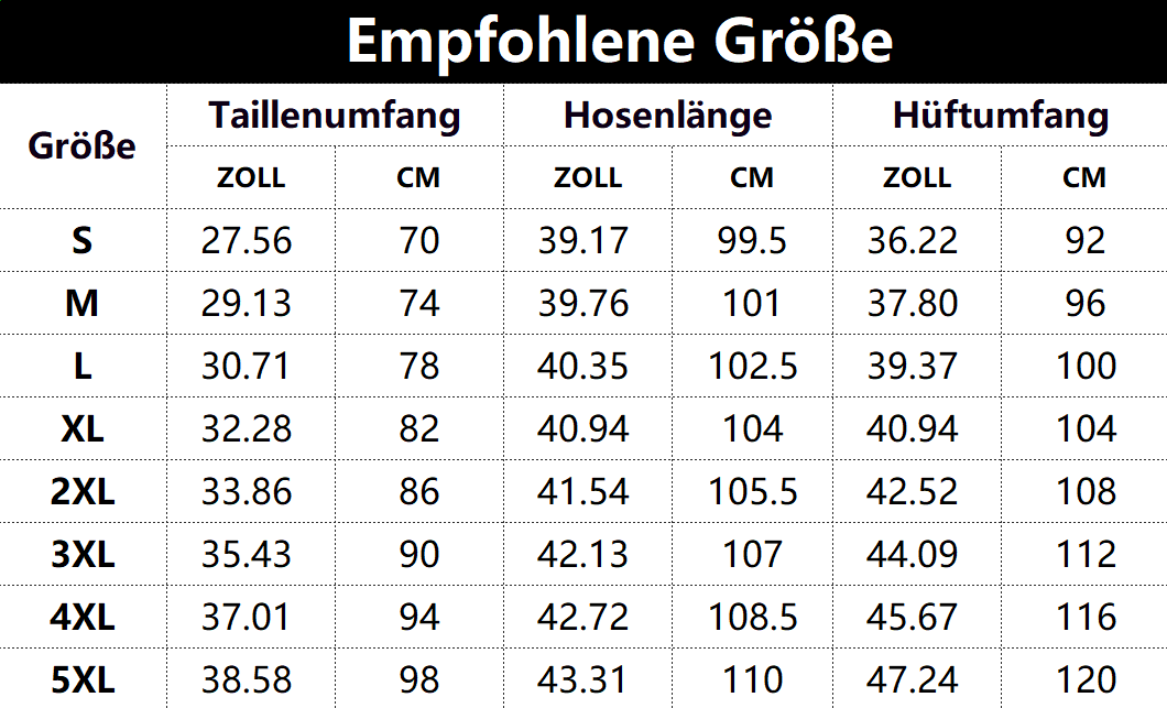 Größen tabelle: