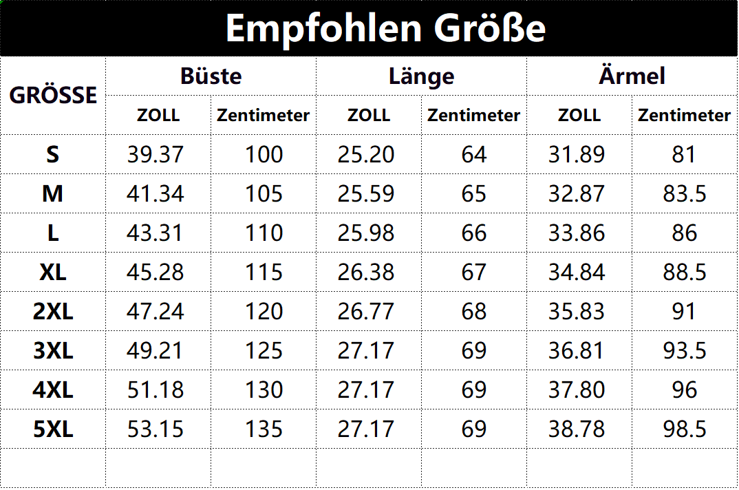 • Vorschlag:* Diese Daten wurden aus der manuellen Messung des Produkts erhalten, es kann um 0,03-0,06 ZOLL/1-3 CM aus geschaltet sein