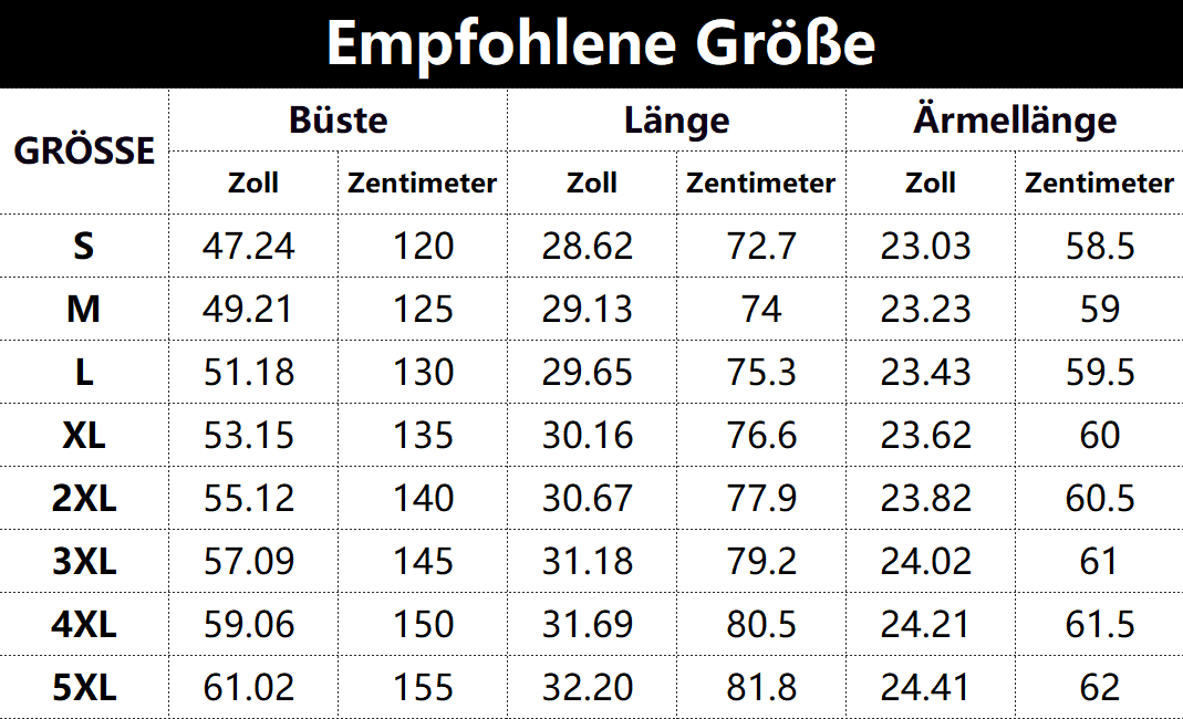 • Vorschlag:* Diese Daten wurden aus der manuellen Messung des Produkts erhalten, es kann um 0,03-0,06 ZOLL/1-3 CM aus geschaltet sein